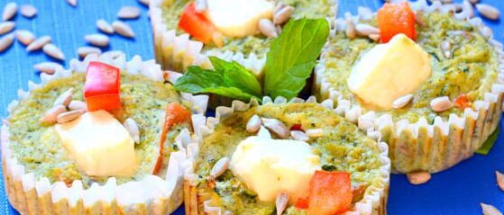 Przygotowanie: Najpierw należy obgotować brokuła (ok. 3 minuty, aby nie był zbyt miękki), a w międzyczasie umyć i pokroić na mniejsze kawałki pomidora i paprykę. Do miseczki zetrzeć cukinię na tarce o grubych oczkach, pokroić ser feta w kostkę, a do osobnej miski wbić jaja i wymieszać z przyprawami. Ugotowanego brokuła pokroić na mniejsze kawałki, połączyć ze sobą wszystkie składniki, dodać mleko, słonecznik i część sera feta (drugą część ułożyć na wierzchu muffin). Piec w piekarniku nagrzanym do 180 stopni przez około 30 minut. Przed wyjęciem babeczek należy sprawdzić czy się podpiekły, gdyż każdy piekarnik działa inaczej i może okazać się, że muffiny trzeba jeszcze podpiec kilkanaście minut.