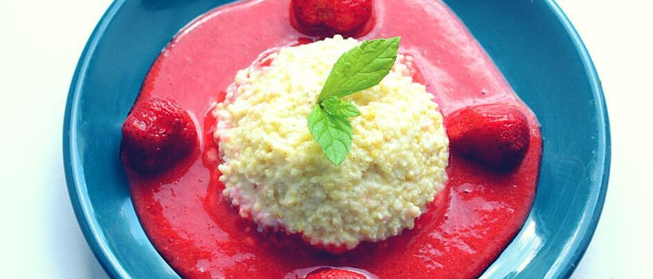 Przygotowanie: Gotujemy kaszę jaglaną na mleku z dodatkiem cukru waniliowego. Gdy proces dobiegł końca miksujemy/blendujemy kaszę, studzimy i wkładamy do lodówki na godzinę. W międzyczasie miksujemy truskawki (możemy użyć mrożonych owoców, bądź poczekać jeszcze miesiąc na sezonowe, pyszne truskawki). Po godzinie wyjmujemy kaszę z lodówki, wykładamy gałkownicą na talerzyk, polewamy musem, dekorujemy miętą i gotowe.